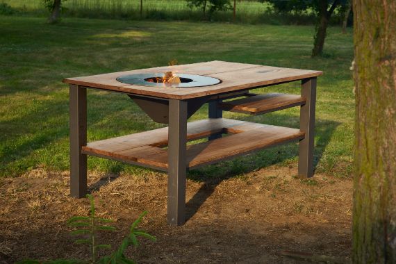 Ocelová plotna slouží ke grilování. Stolová deska a police poskytují praktický odkládací prostor.
